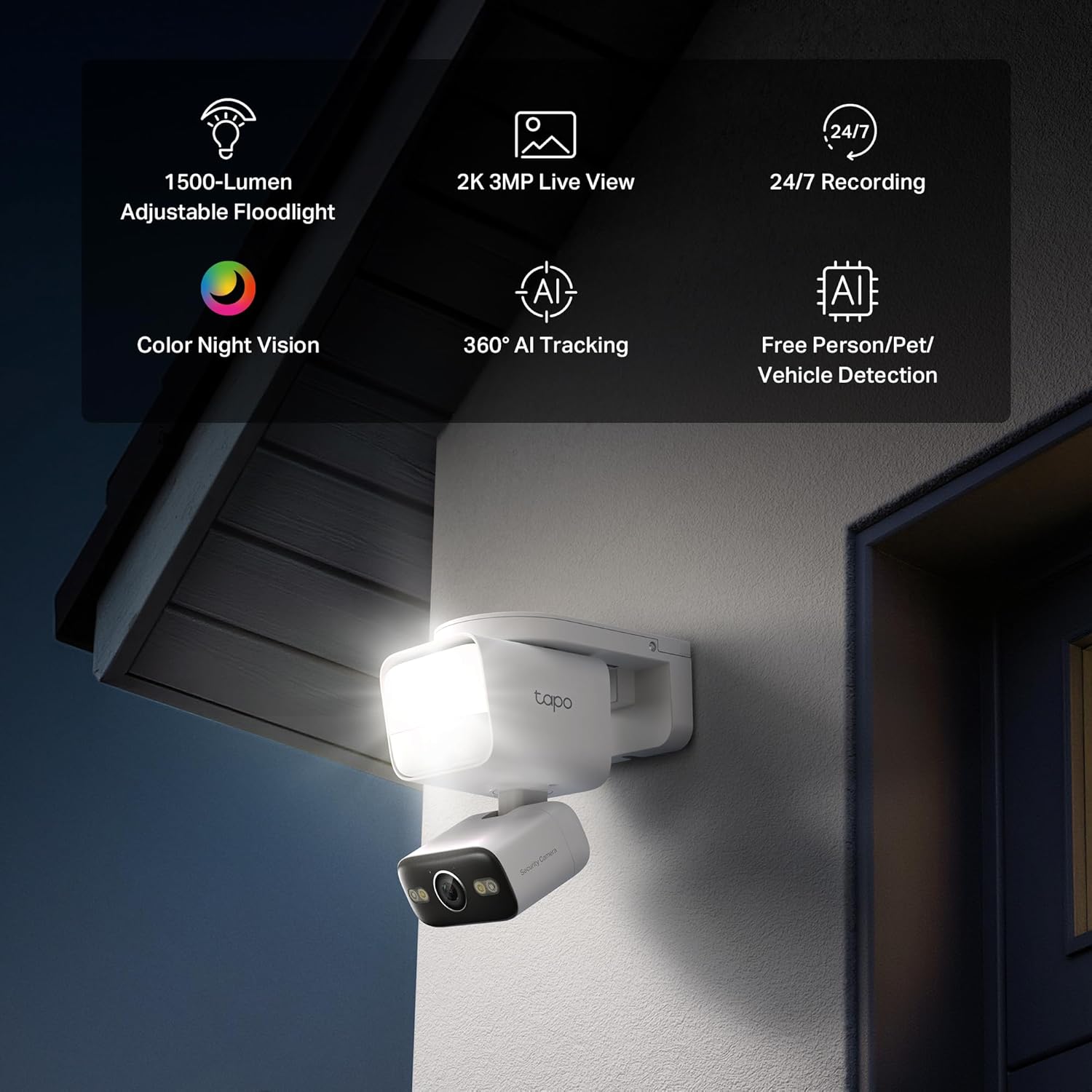 Lighting 1× Floodlight (Color Temperature: 4000K, Brightness: 1500 Lumens) Motion Activated, App-Controlled